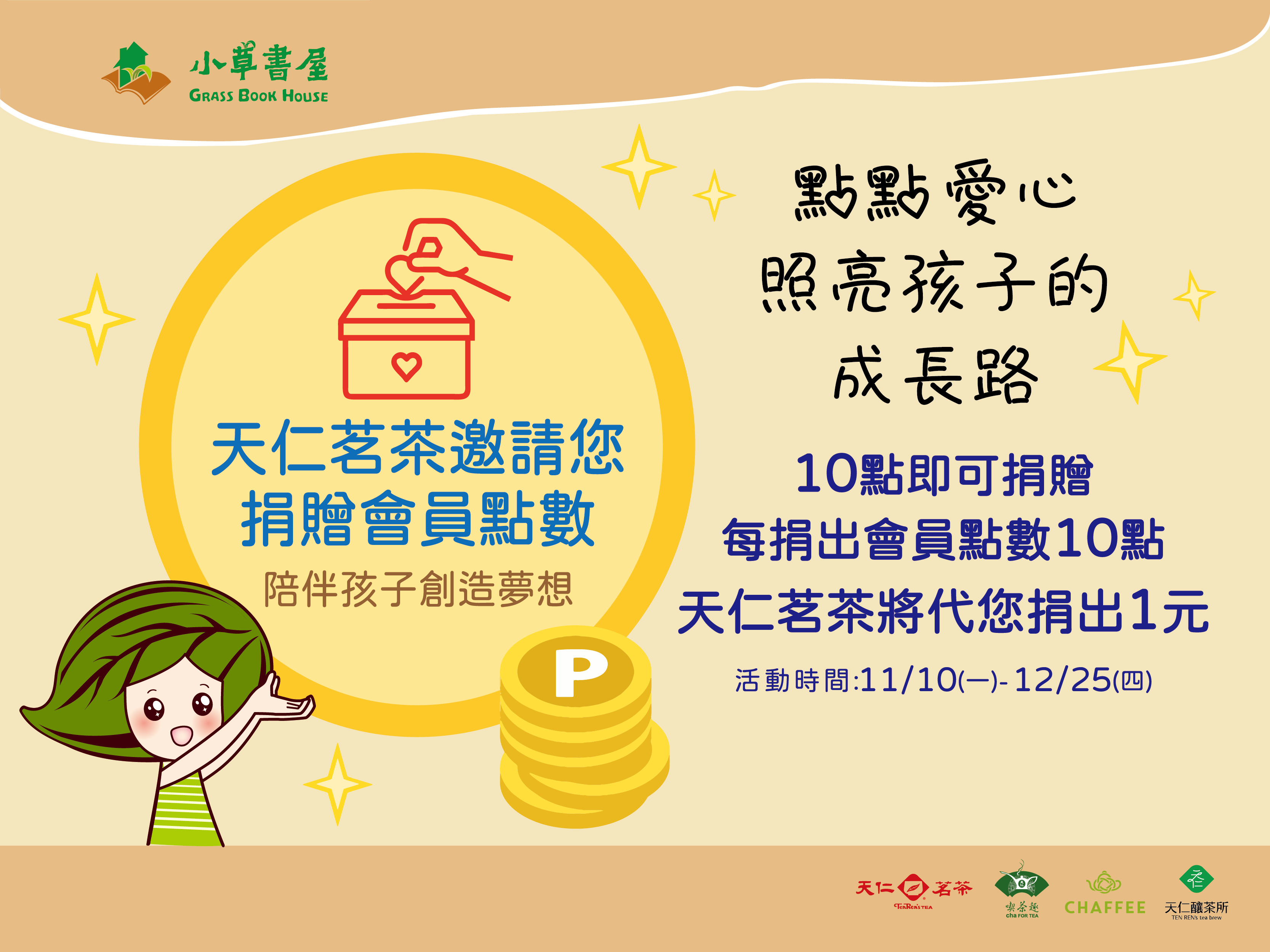 ★活動辦法:10點即可捐贈,每捐出會員點數10點,天仁茗茶將代捐出1元,款項將捐贈社團法⼈台灣城鄉永續關懷協會,運用於『小草書屋』,陪伴孩子創造夢想,擁有力量改變未來