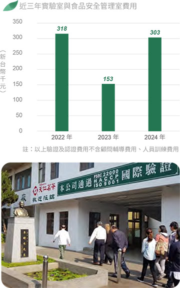為符合食品安全及品質管理等各項作業規範所需之專業能力,本公司也鼓勵相關單位的主管及同仁進修取得相關證照。截至2024年止,已有19位主管及同仁取得食品安全及品質管理系統證照或證書,天仁茶業主管及同仁合計共取得101項證照。食品安全實驗室也預計將於2025年,每季舉行兩場次教育訓練。主題包含微生物分析、動物用藥快篩操作、實驗室生物安全訓練、生物安全主管在職訓練及實驗室主管在職訓練等。